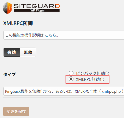 →【SiteGuard】→【XMLRPC防御】をクリック - 「XMLRPC無効化」にチェックを入れる